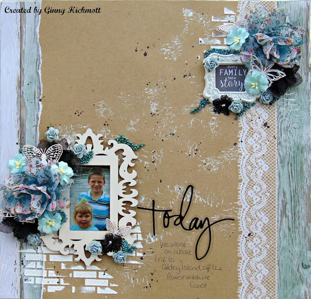 In the top right hand corner of the sketch there is a small frame. the one I added to my layout is made with a Martha Stewart mould with Ice Resin, the Ice Resin is also from a previous Technique it Add on kit from Swirlydoos.