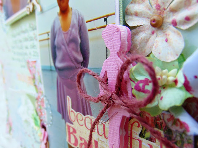 My 'stack something' on the evidence list was the ballerina die cut in the bottom right of the layout. I cut 3 ballerinas out with pink cardstock, the middle one in a paler cardstock to the other two, and using foam pads stacked them as if doing some decoupage. I then finished off by adding my string bow on top.